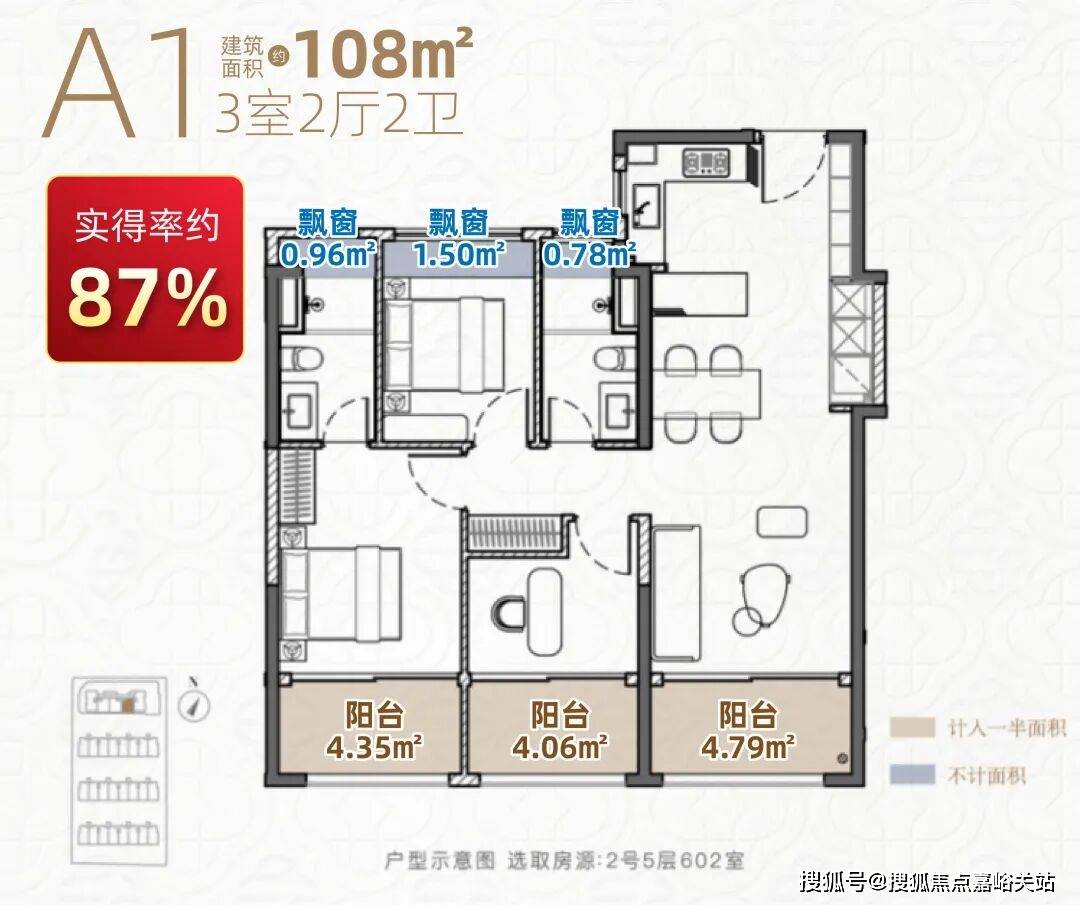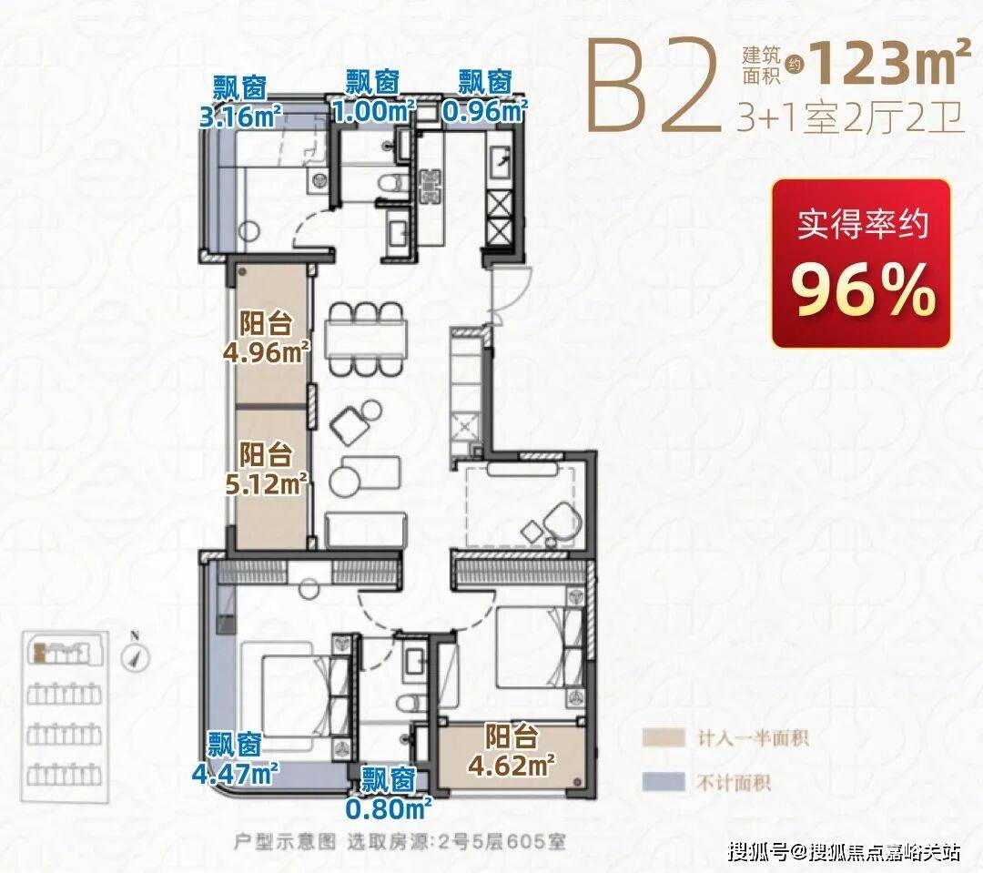 3阳台+5飘窗,合计赠送面积约17.7㎡,实得率更是惊人地抵达了约96%(2号楼05室)。