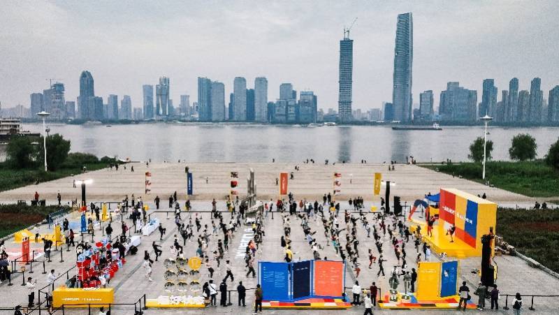 正在武汉汉口江滩三阳广场,江干运动热诚与浩大长江共振,客人们正在运动中感想武汉的疾乐脉动。