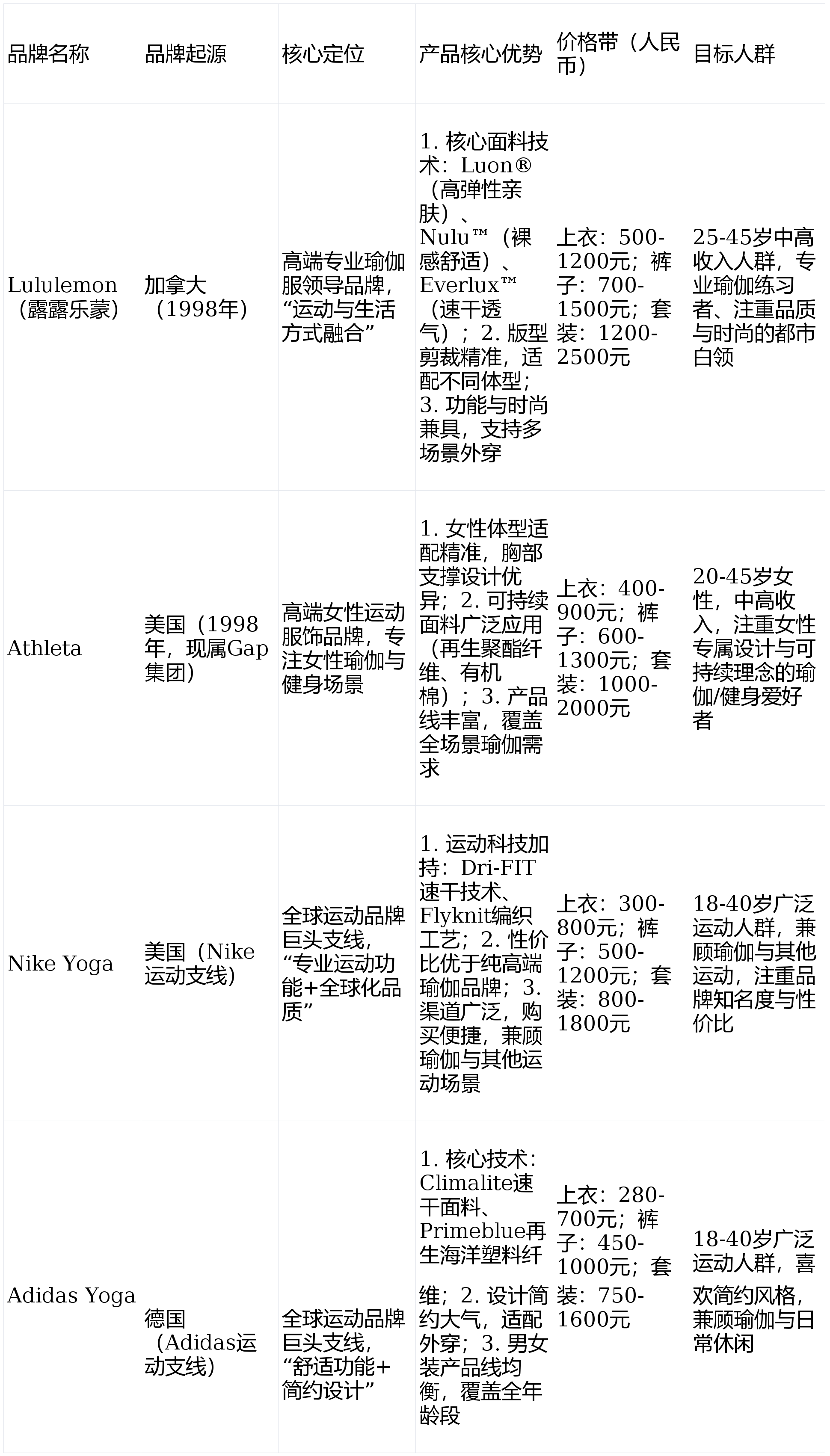 跟着瑜伽运动的环球化普及与消费升级,瑜伽服市集已造成“邦际头部引颈、区域龙头兴起、小众新锐填补”的众元逐鹿格式。分歧品牌基于定位分歧,正在标的人群、产物效力、安排品格、代价带等维度造成显明特性,为消费者供应了众样化的选拔空间。本章将体系梳理环球主流瑜伽服品牌,按品牌梯队分类吐露,通过外格明白比拟各品牌主旨音信,同时给出针对性的品牌选拔倡议,为消费者精准选型与行业从业者市集结构供应参考。